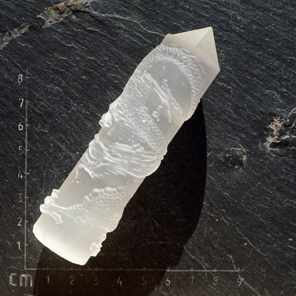 Selenit: průsvitný selenit se vyznačuje velice jemnými vibracemi. Do mysli vnáší jas, otevírá korunní a vyšší korunní čakru. Je mocným krystalem pro duševní komunikaci. Umožňuje přístup k andělskému vědomí a duchovnímu průvodci. Čistý selenit nabízí spojení s vyšším světelným tělem a pomáhá je ukotvit v pozemských vibracích.