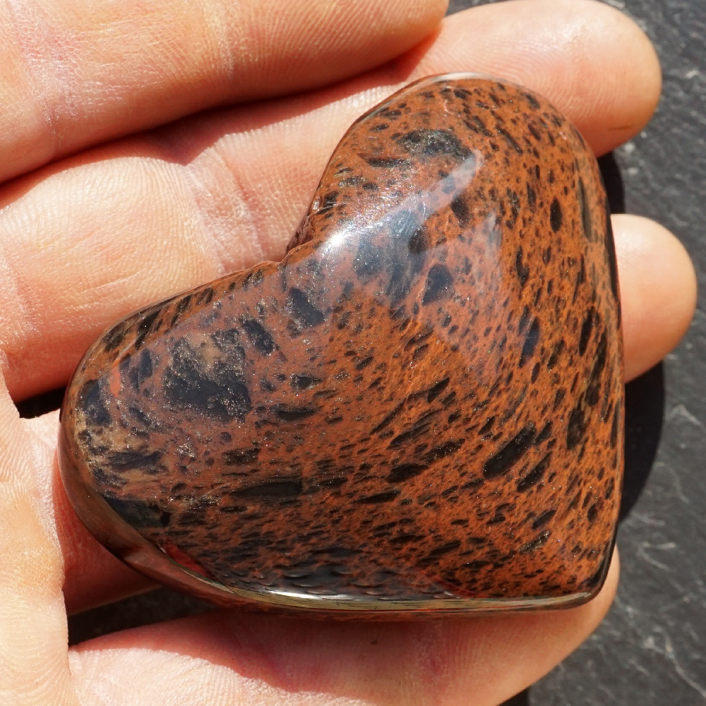 Mahagonový obsidián: působí jemněji než černý. Rezonuje se zemí, uzemňuje, chrání a dodává sílu. Oživuje stanovené cíle, odstraňuje energetické bloky a podněcuje dosažení vyšších rovin. Je to stabilizující kámen, jenž posiluje slabou auru a navrací správnou rotaci duchovní čakře stejně jako čakře solar plexu. Aktivuje logické myšlení a dovoluje nám soustředit se na nejpodstatnější problémy našeho života. Je dobré mít jej sebou u zkoušek a při důležitých rozhodnutích.