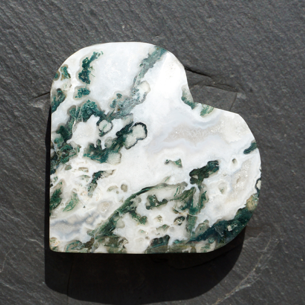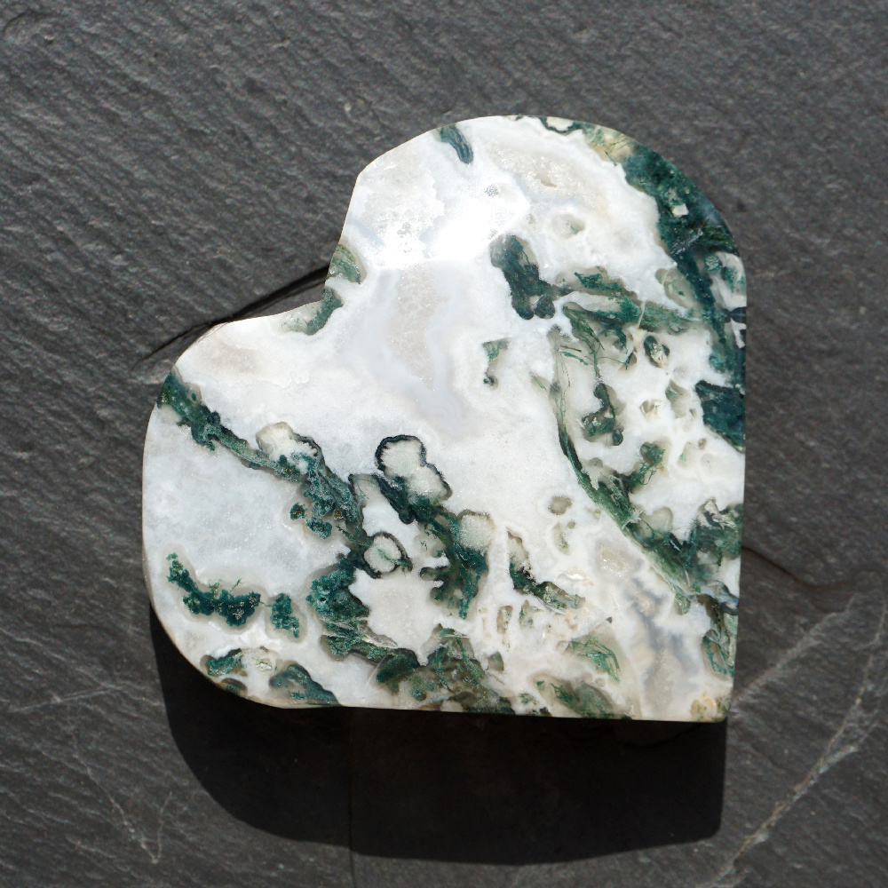 Mechový achát: je silně spjat s přírodou, se schopností obnovit narušenou rovnováhu. O mechovém achátu se tvrdí, že osvěžuje duši a umožní spatřit krásu ve všem okolo. Pomáhá snižovat citlivost na počasí a znečištění životního prostředí. Jedná se o mimořádně užitečný kámen pro každého, kdo pracuje v zemědělství nebo je nějak spjat s botanikou. Jokožto kámen zrození pomáhá mechový achát při práci porodním asistentkám. Mírní bolest a zajišťuje zdárný porod. Jedná se o kámen symbolizující nový počátek a podporující odstraňování duchovních bloků nebo spoutání. Je to kámen hojnosti a přitahuje bohatsví. Lze jej použít k dvojímu účelu. Rozumově orientovaným lidem pomáhá rozvíjet intuici, zatímco osobám silně intuitivně založeným umožňuje nasměrovat energii k praktickým záležitostem.