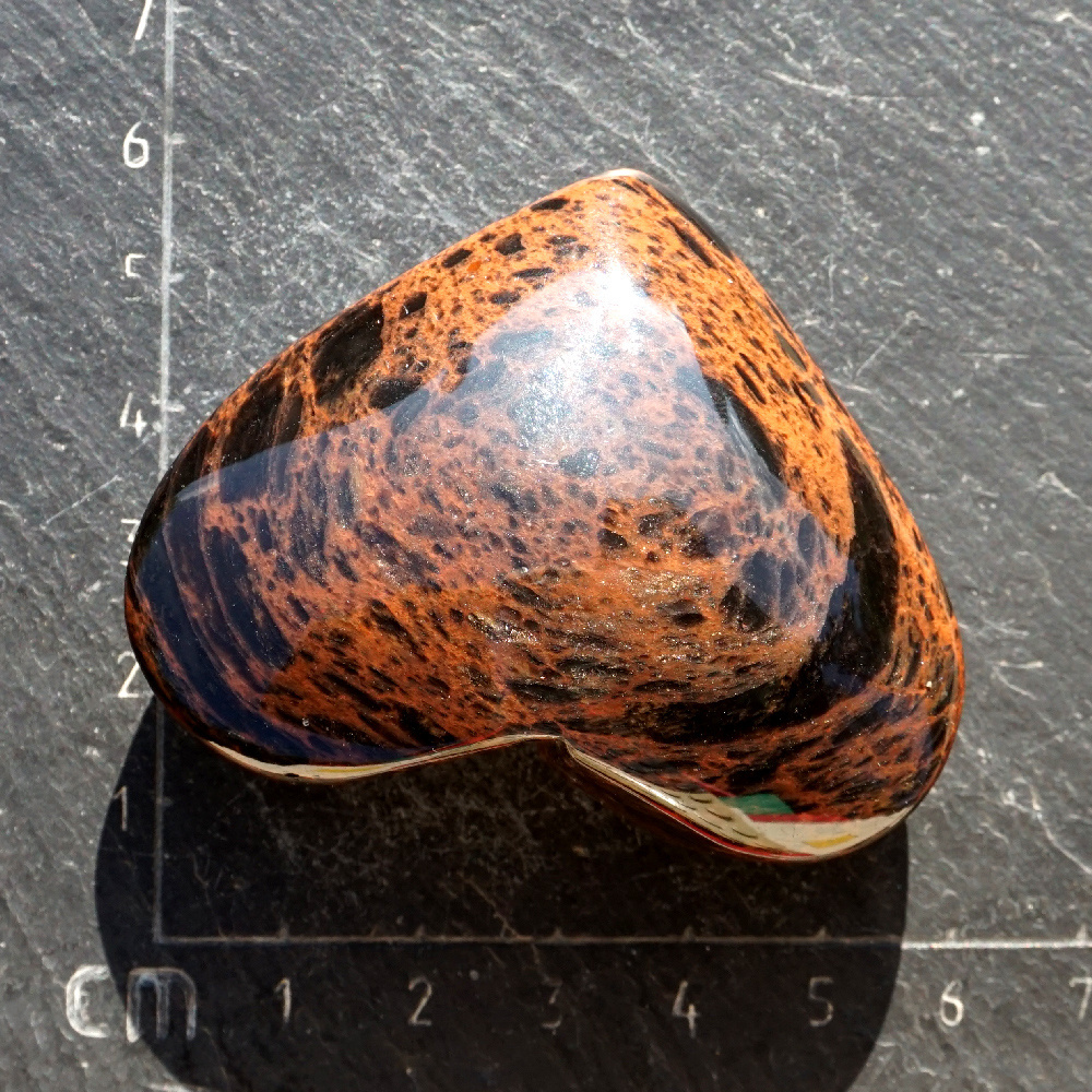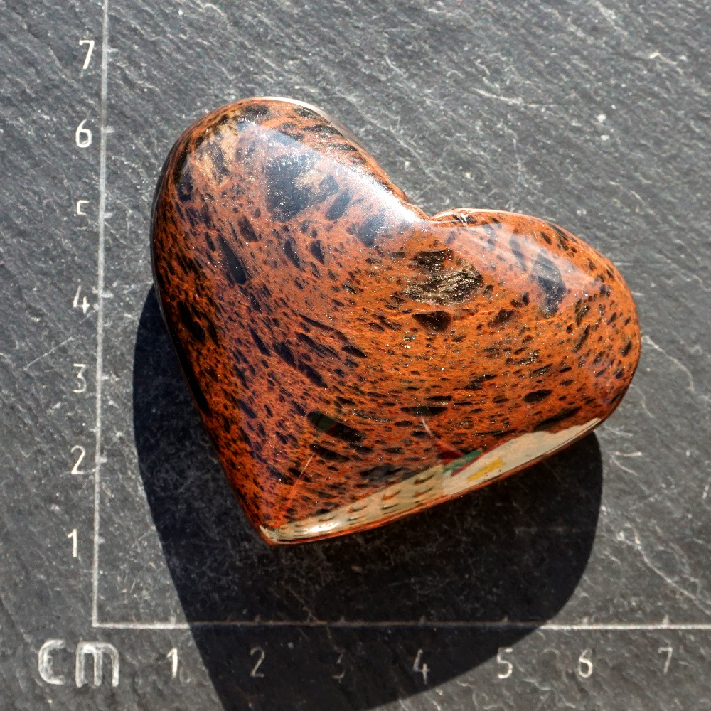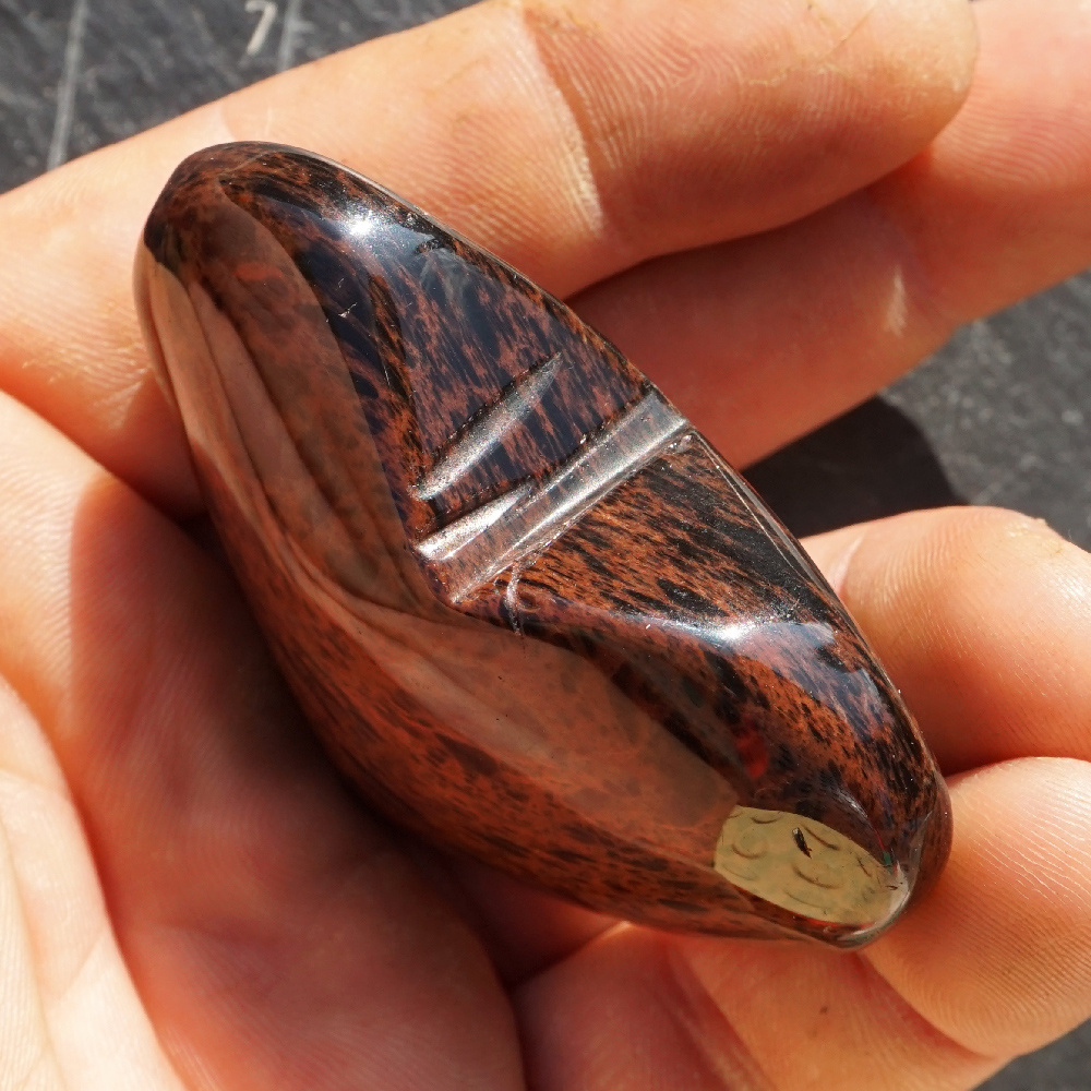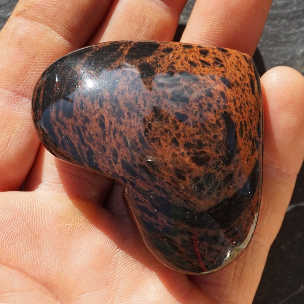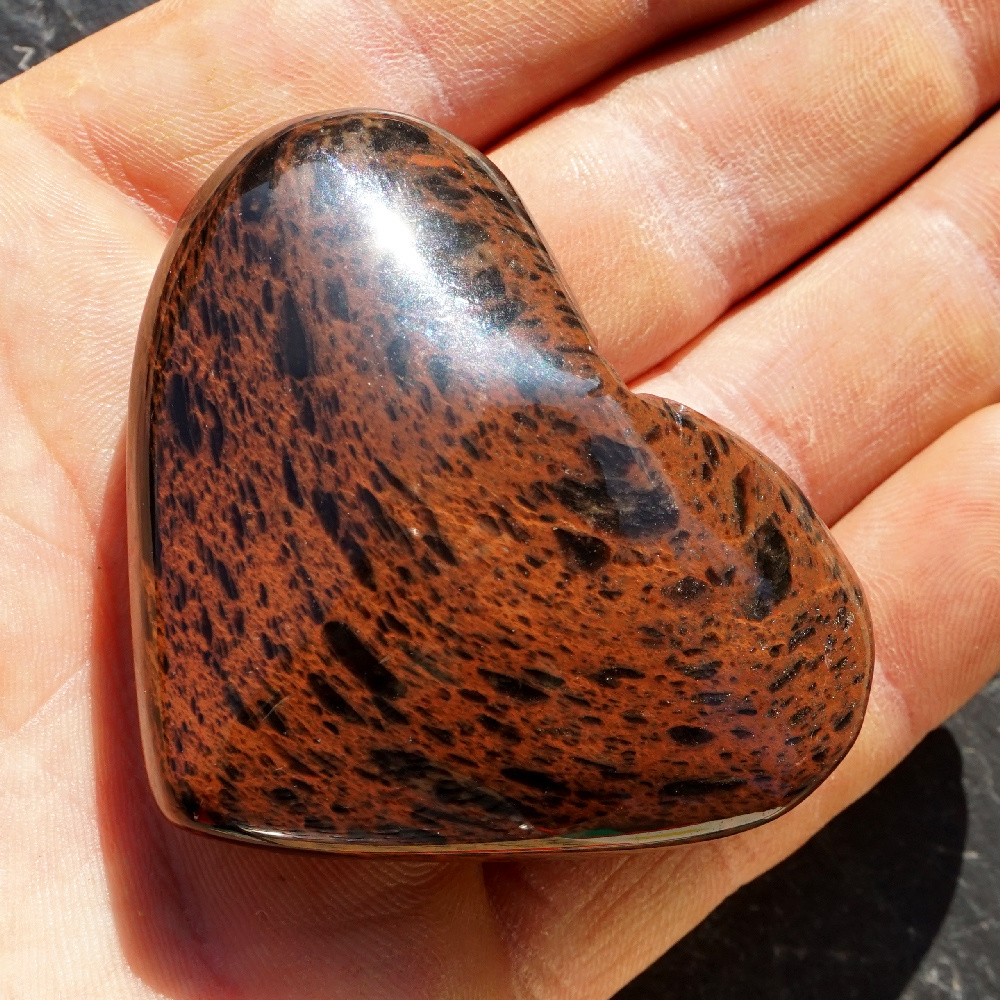 Mahagonový obsidián: působí jemněji než černý. Rezonuje se zemí, uzemňuje, chrání a dodává sílu. Oživuje stanovené cíle, odstraňuje energetické bloky a podněcuje dosažení vyšších rovin. Je to stabilizující kámen, jenž posiluje slabou auru a navrací správnou rotaci duchovní čakře stejně jako čakře solar plexu. Aktivuje logické myšlení a dovoluje nám soustředit se na nejpodstatnější problémy našeho života. Je dobré mít jej sebou u zkoušek a při důležitých rozhodnutích.