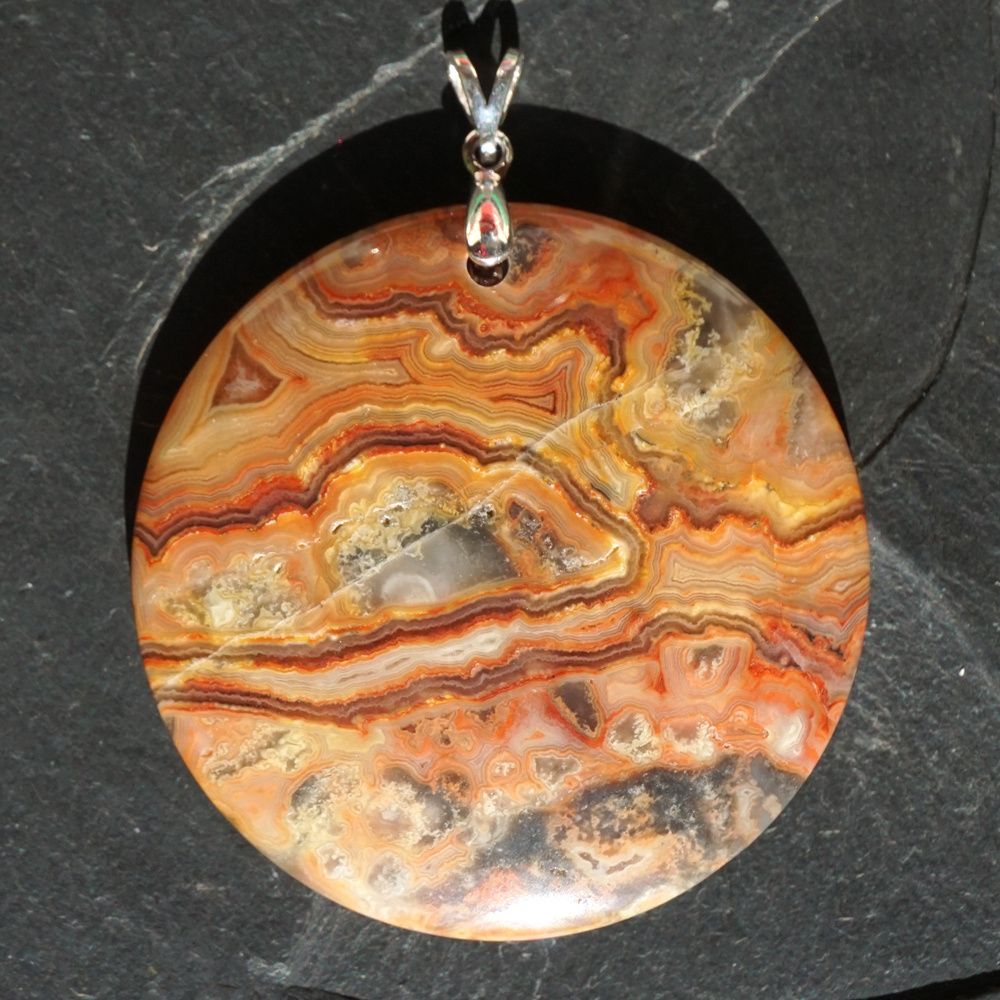 Krajkový achát: je to zázračný léčivý kámen. Jeho jemná energie ochlazuje a uklidňuje, vnáší do mysli mír a klid. Obzvláště účinný je při aktivaci krční čakry, umožňující svobodné vyjadřování myšlenek a pocitů. Otevírá cestu ke kontaktu s vyššími energiemi. Zajišťuje svému nositeli oporu a obrovský zdroj síly.